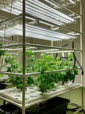 土を使わずに水と栄養だけで植物を育てるための機械です。本校では、オーガニックコットンの栽培に挑戦しています。