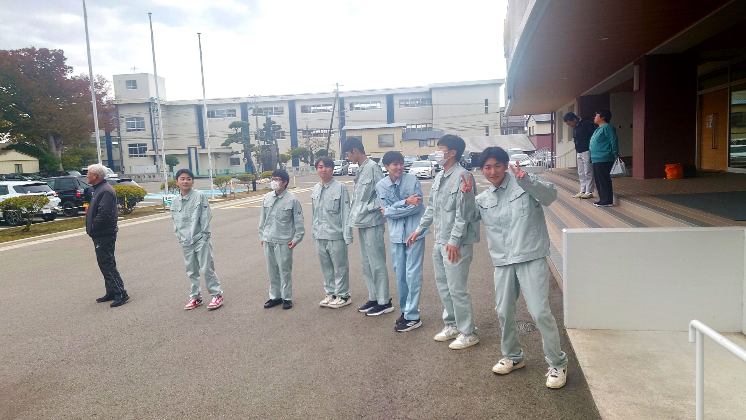 体育館の屋根よりも高く上がり緊張する生徒が多い中、下に向かって手を振る余裕のある生徒もいました。