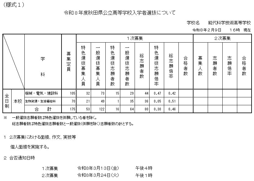 入試情報 令和8年度 秋田県公立高等学校入学者選抜について 2026.02.09 令和8年2月9日 16時現在 求める生徒像及び選抜方法等 [リンク]秋田県公立高等学校入学者選抜情報(美の国あきたネット)
