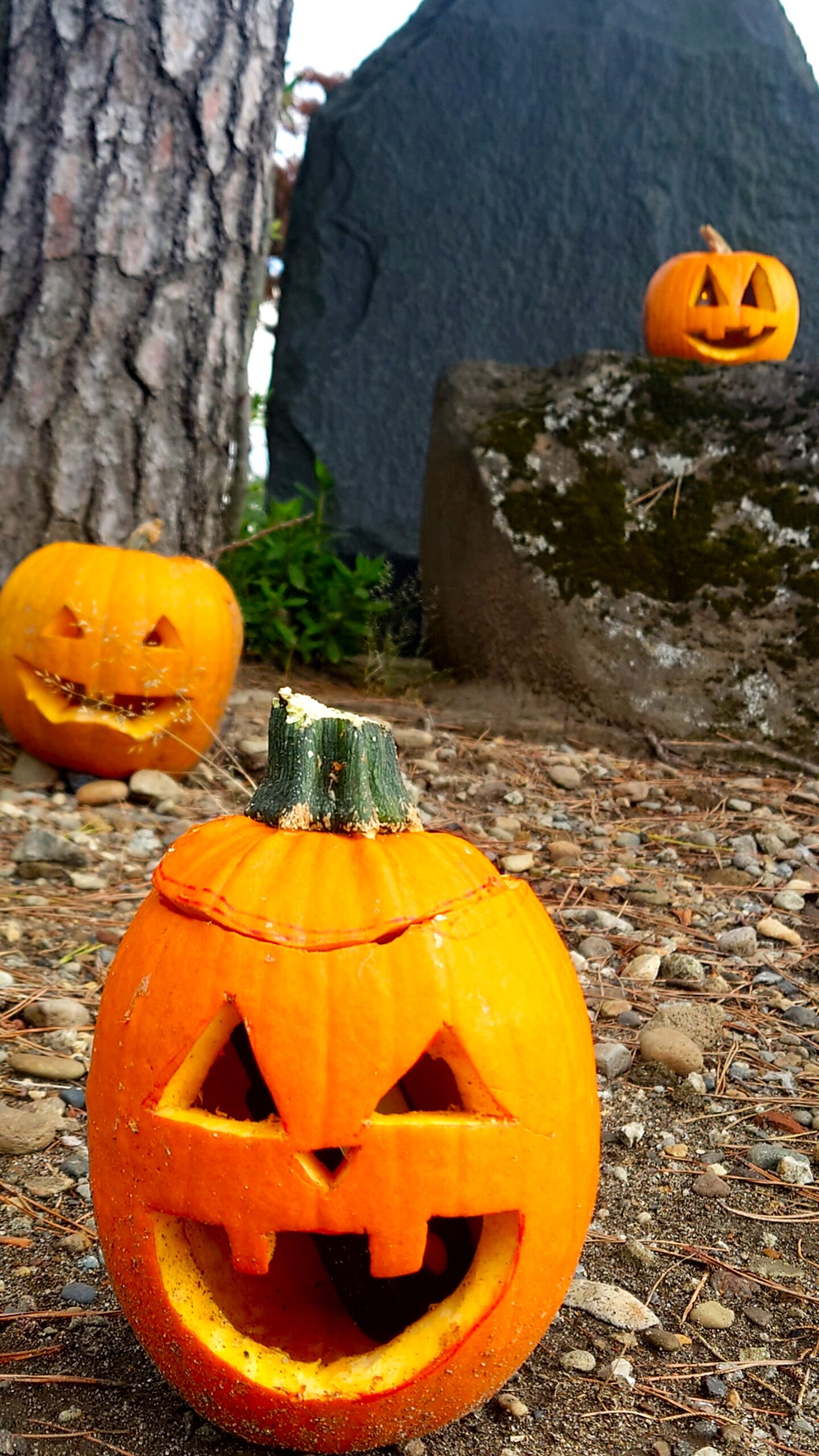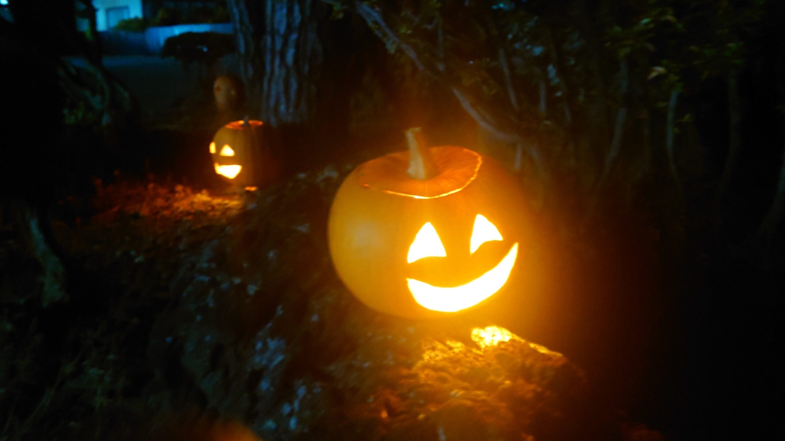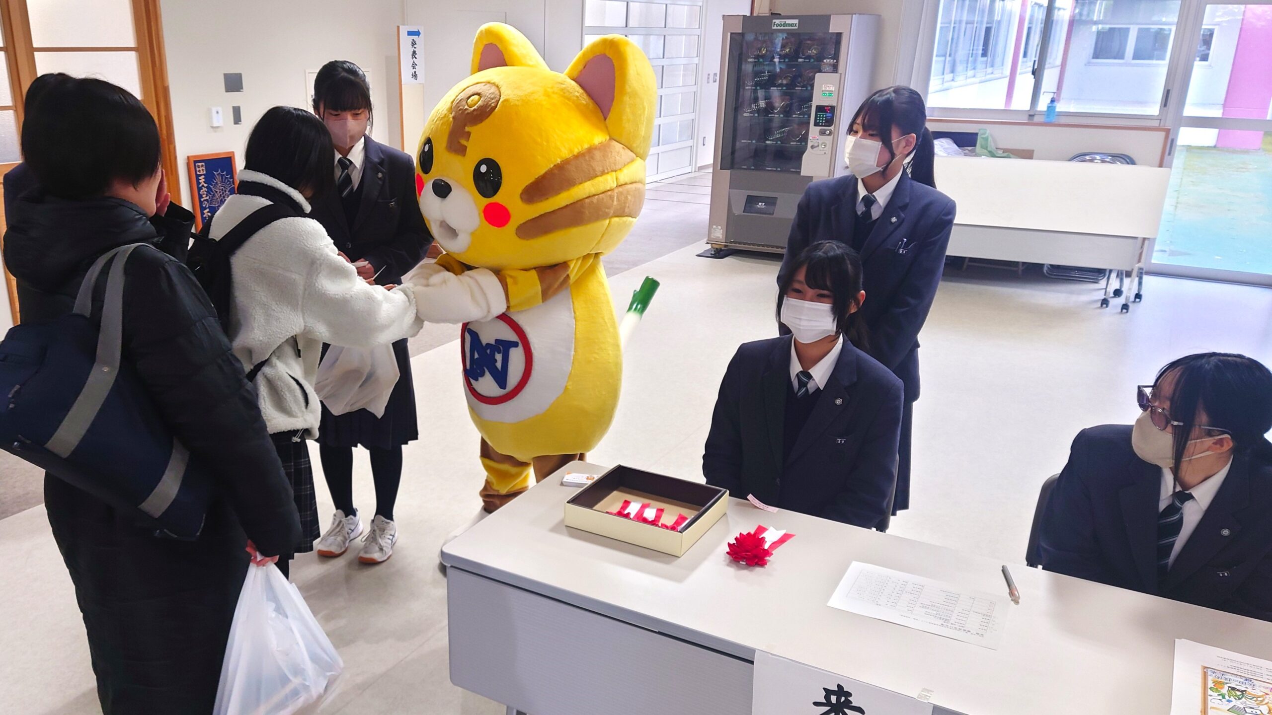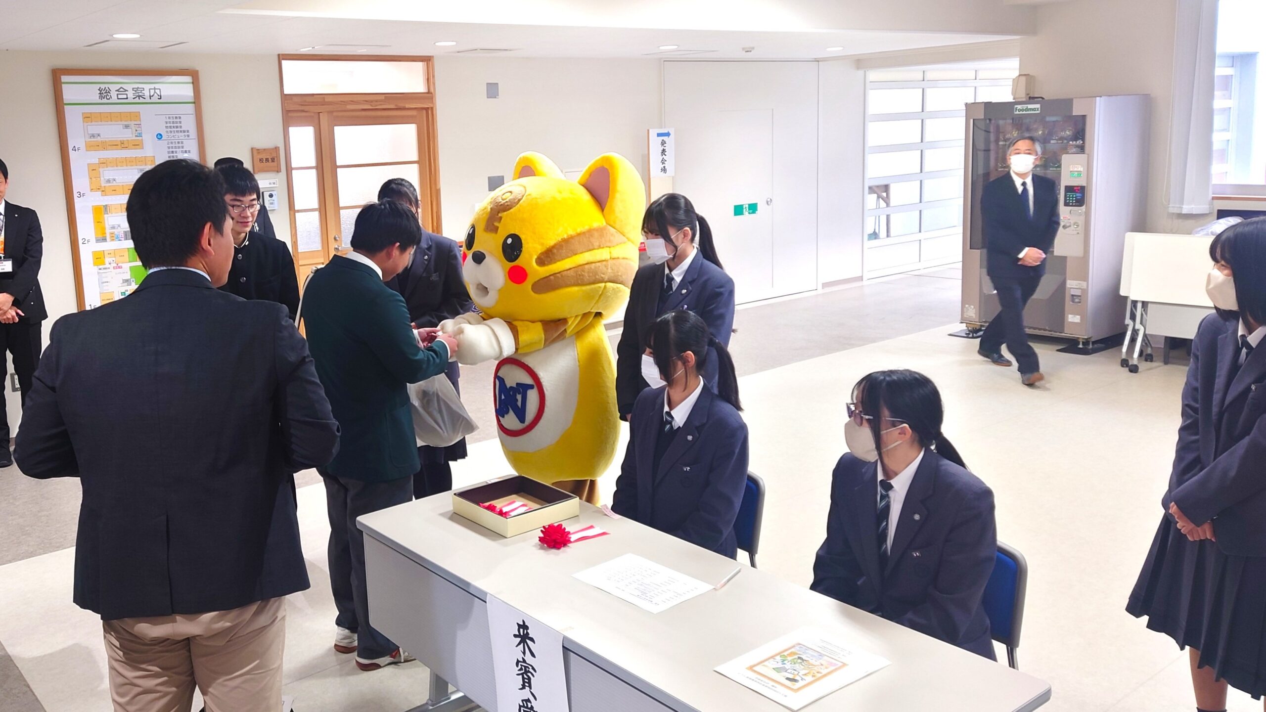 おもてなし企画として前庭と昇降口にカボチャを飾り、受付では5周年記念キャラクター「にゃぎー」が名刺を配りました。