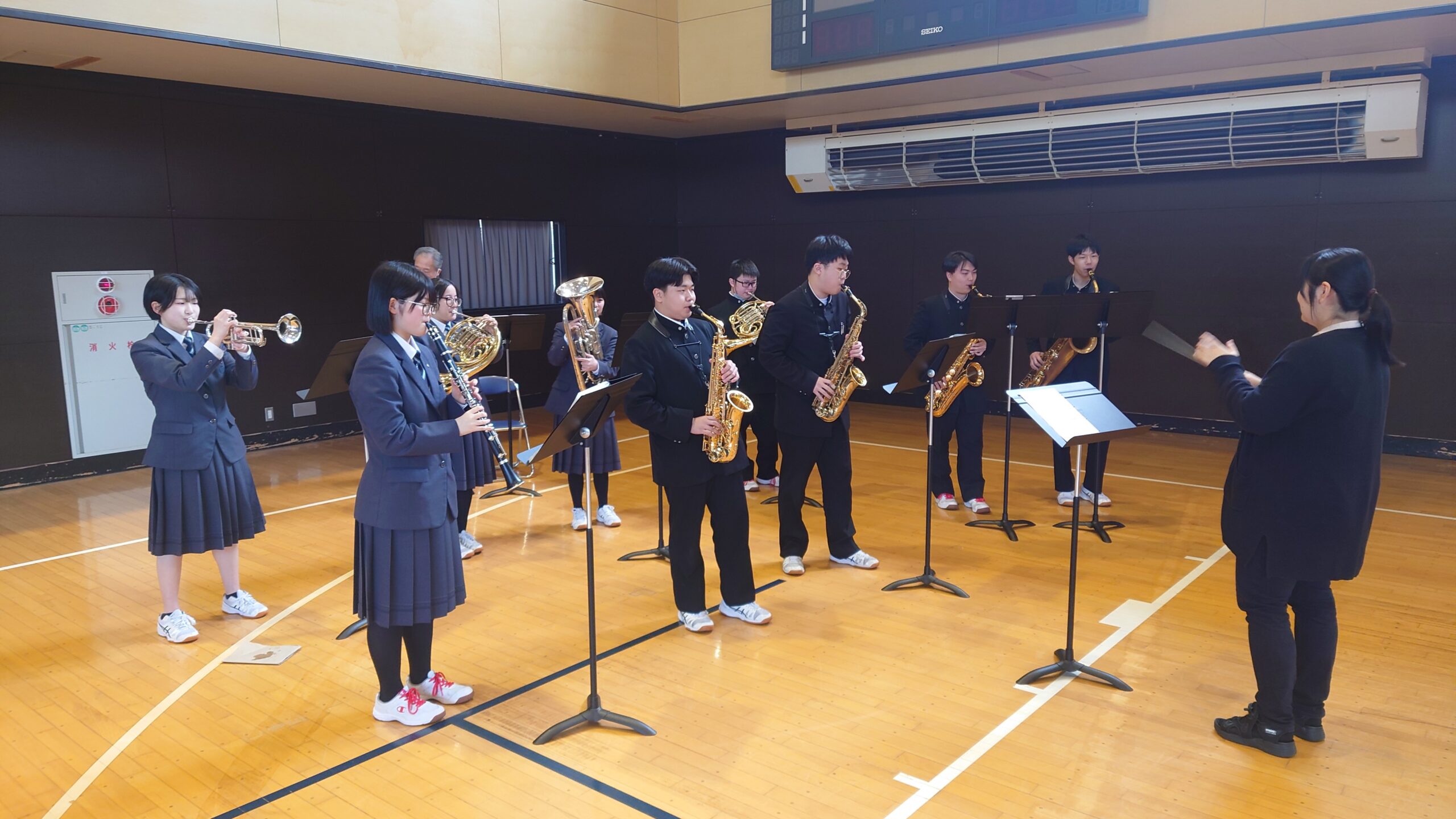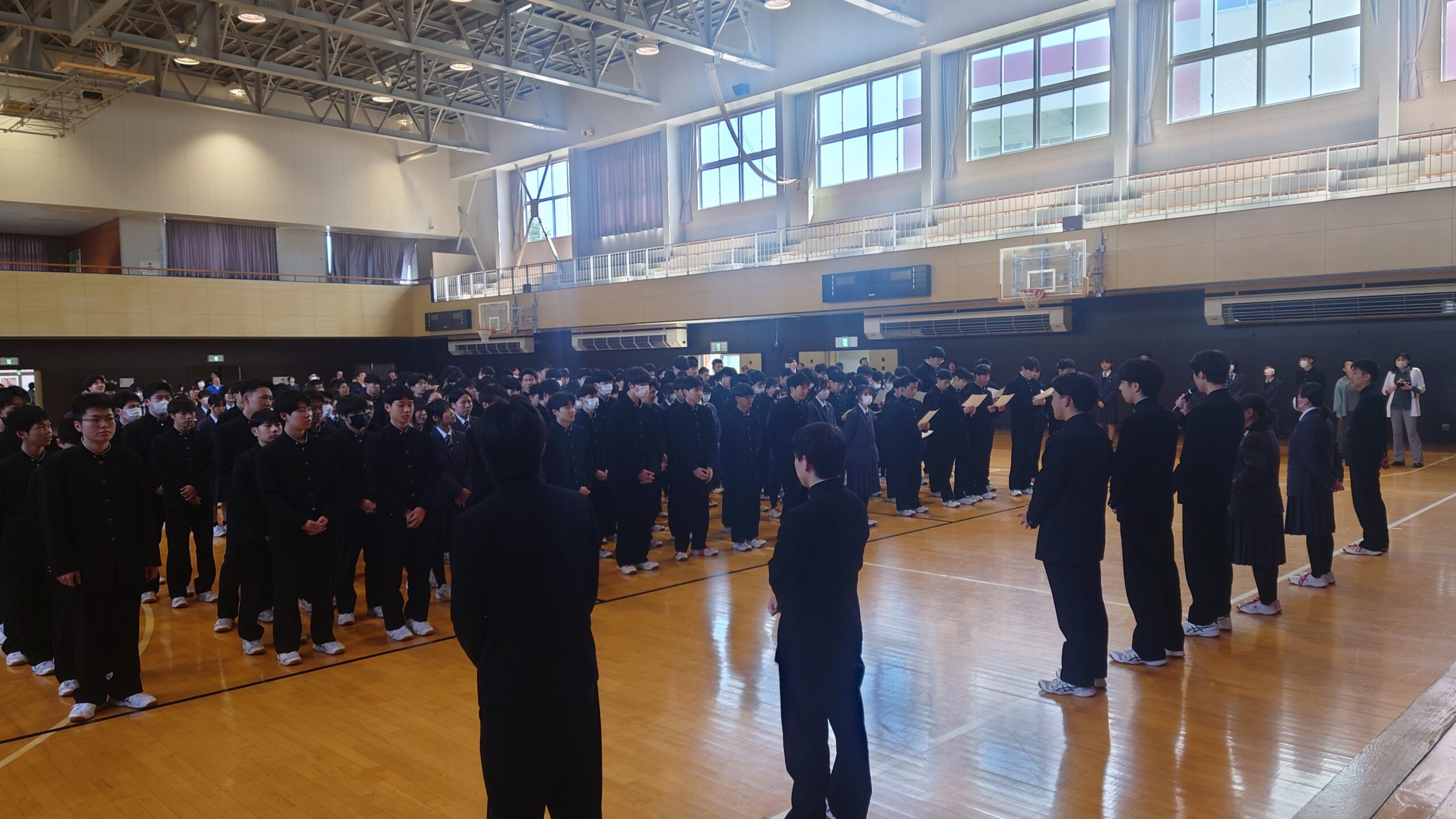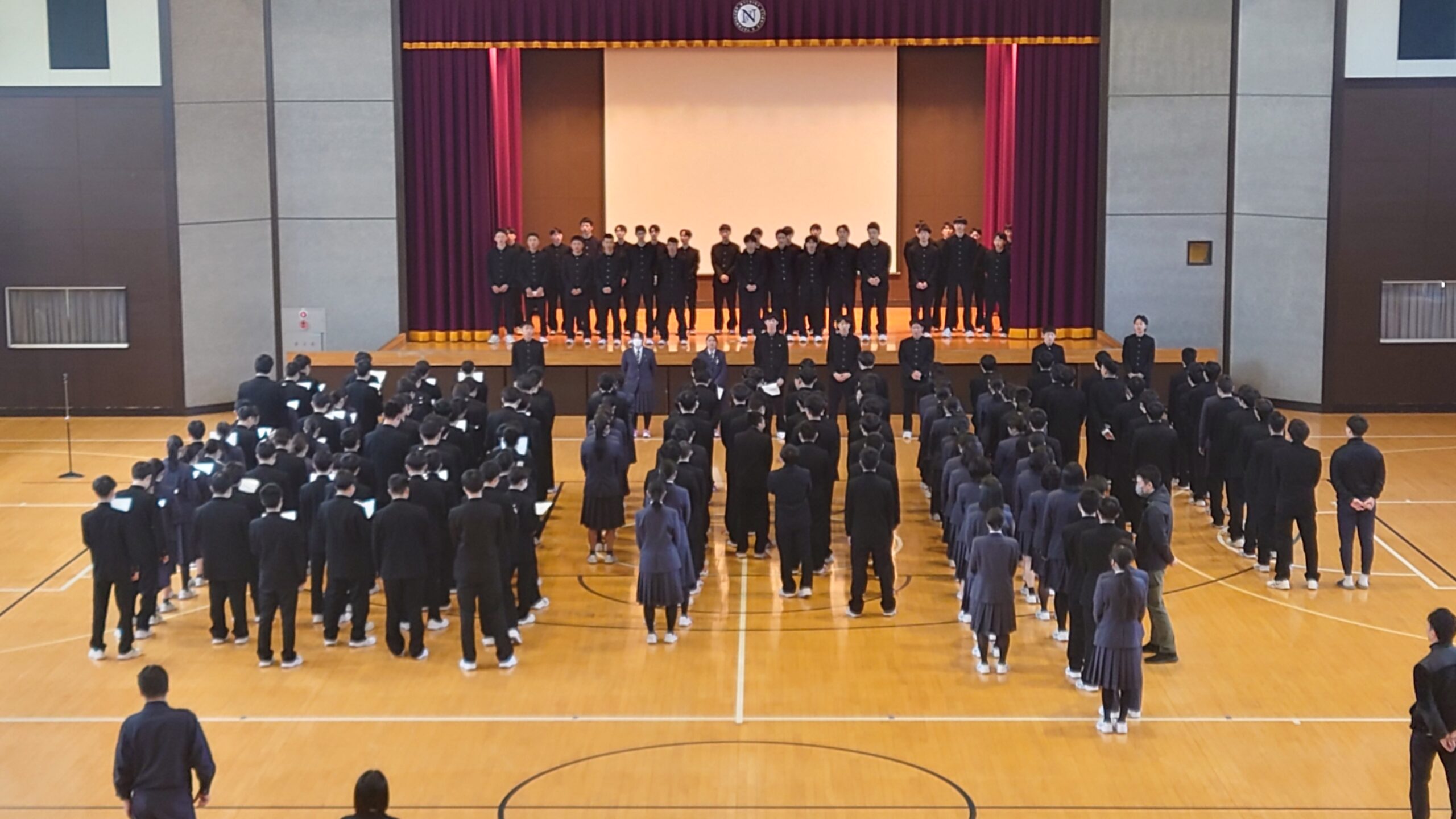 硬式野球部とバスケットボール部の2、3年生がステージに上がり、応援委員の指示に従って率先して大きな声で校歌を歌いました。